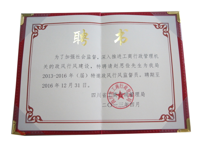 5月,為加強社會監(jiān)督,推進全省工商行政管理系統(tǒng)的政風行風建設,四川省工商行政管理局聘請了2013-2016年(屆)特邀政風行風監(jiān)督員,集團趙董事長作為企業(yè)家代表也獲邀請。此次特邀的監(jiān)督員包括省政協(xié)委員、省直機關工委巡視員李成林;省政協(xié)委員、省政法委巡視員賈月成等14位來自省內政界、商界、媒體的代表。特邀監(jiān)督員人選由省級工商局請政府糾風工作主管部門推薦,經征求本人意見后正式聘請并頒發(fā)聘書和證件。