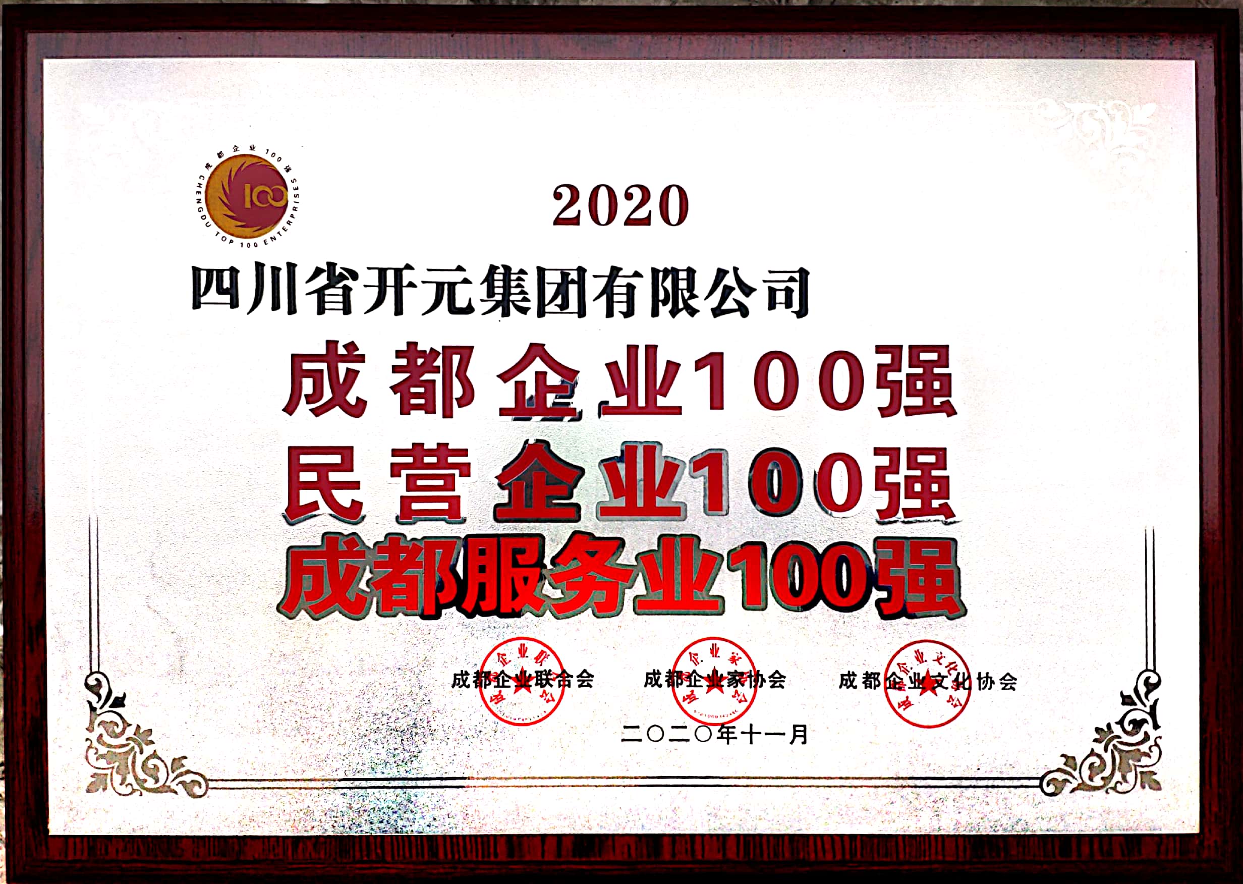 四川開元集團成功蟬聯(lián)2020年度“成都市企業(yè)100強”、“成都市服務(wù)業(yè)100強”和“成都市民營企業(yè)100強”。